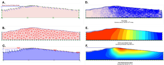 (A) Numerical model of the cross-section of the AB natural dam section. (B) Finite element mesh generated using 15-node triangular elements. (C) Phreatic line for the upstream water level up to the crest of the dam for analysis. (D) Seepage flow through the body of the natural dam AB section. (E) Ground Water Head under steady seepage through the body of the dam. (F) Displacement contour indicating large deformation of the downstream slope under the prevailing condition of a rise in water level in the lake and permafrost melting.