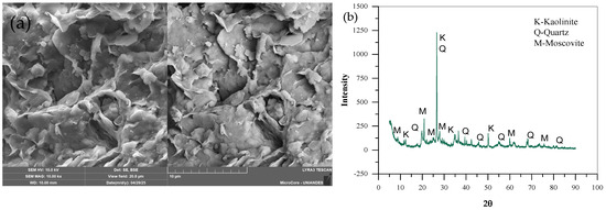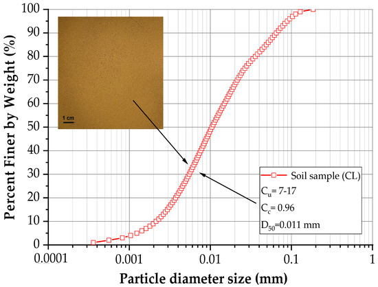 Additionally, Figure 1 presents the grain size distribution curve of the soil obtained through laser diffraction analysis using the Honeywell Microtrac X100 laser diffraction (Microtrac, York, PA, USA) system equipped with the Microtrac SRA200 accessory. A sodium hexametaphosphate solution was used as the dispersing agent. as well as a representative photograph of the material in its dry state. According to the Unified Soil Classification System (USCS) [28], the soil was classified as a low-compressibility clay (CL). The clay’s colloidal activity, determined according to Skempton’s criteria [29], was calculated as 1.60. The soil was composed mainly of kaolinite clay minerals (Figure 2) [27].