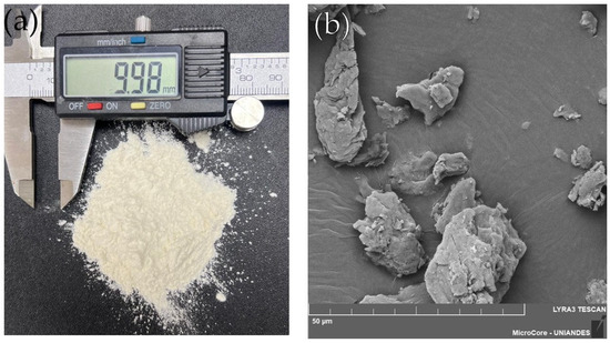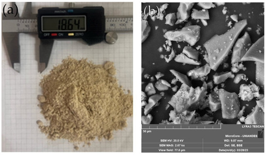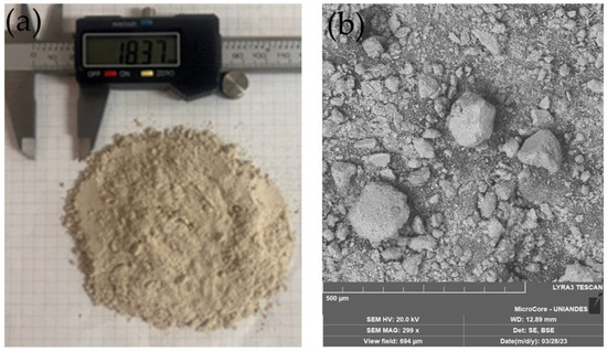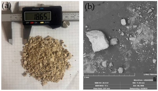 The CLW (Figure 3) was collected from a quarry located near Cartagena (9°57′57.04″ N 75°6′5.77″ O). The material was subjected to Gs testing, chemical analysis, and morphological characterization using SEM. Figure 3a shows the general appearance of the residue, while Figure 3b displays its surface structure obtained via SEM (MAG: 72×; FOV: 2.87 mm). The CLW exhibited a Gs of 2.52, gray coloration, and a textural composition predominantly consisting of MS (38%) and CS (30%), along with a 15% silt fraction. According to USCS [28], the CLW was classified as SW. The Cu and Cc coefficients were 13.67 and 1.59, respectively [6]. The chemical composition is presented in Table 3.