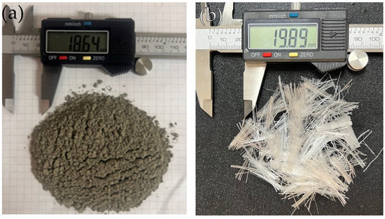 The binder employed in this study was Type III Portland cement (Figure 7a), known for its high early strength. According to the manufacturer’s technical specifications, its chemical composition is predominantly CaO (60.7%), MgO (4.1%), and SO3 (3.0%). The insoluble residue and fineness, expressed as percentages, were reported as 0.77% and 0.04%, respectively [12]. The compressive strength at 28 days of curing was indicated to be 53 MPa. The specific gravity of the cement particles was determined to be 3.11 g/cm3.