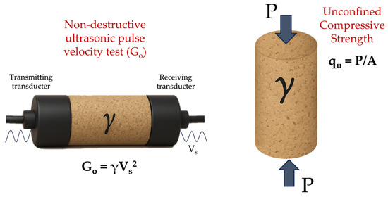 Following immersion, specimens were tested for stiffness and unconfined strength. The small-strain shear modulus (Go) was evaluated using Pundit Lab Plus equipment (Proceq, Zúrich, Switzerland), following the guidelines established in ASTM C597 [37]. This equipment enabled the generation and detection of both compression (P) waves at 54 kHz and shear (S) waves at 250 kHz. The wave propagation velocities were used to compute the shear modulus at small strains (Go), employing the relation Go = γVs2.