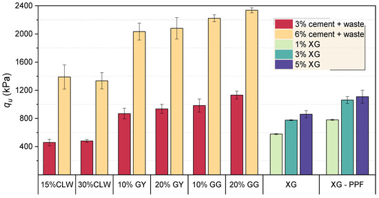 As shown in Figure 9, the results indicate that GG exhibited the best performance in terms of unconfined compressive strength, reaching values up to 2335.97 kPa, particularly at a 20% dosage combined with 6% cement. GY also demonstrated notable improvements, achieving 2079.96 kPa under similar conditions. In contrast, CLW showed a less efficient response; the 15% CLW mixture outperformed the 30% mixture, suggesting a possible saturation effect or lower reactivity of the residue at higher contents. The associated standard deviations reveal greater variability in CLW and GY compared to GG, emphasizing the consistent performance of the latter. Regarding XG and XG–PPF, a progressive increase in strength was observed with increasing XG content, reaching a maximum of 859.59 kPa. The addition of polypropylene fibers (XG–PPFs) further enhanced mechanical behavior, achieving 1109.15 kPa at 5% XG, surpassing several cemented residue mixtures. These formulations also displayed the lowest standard deviations, indicating more homogeneous behavior. Although their strength was lower than that of GG or GY mixtures, their stability and sustainability position them as a viable alternative in contexts where mechanical uniformity and environmental considerations are prioritized.