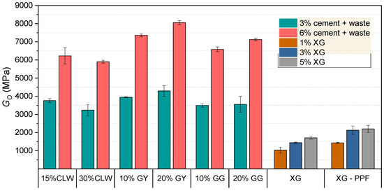 Stiffness of eight stabilized soil mixtures compacted at optimal dry density (γd = 17.6 kN/m3). The mixtures include construction residues (CLW, GY, GG) with 3% and 6% cement, XG, and XG–PPF.