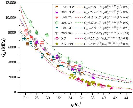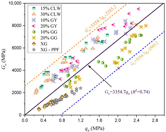 The relationship between stiffness and strength is shown in Figure 11. The general correlation obtained for all mixtures was expressed as Go = 3354.7qu, with a determination coefficient of R2 = 0.74. Although this represents a moderate fit, it highlights the limitation of applying a grouped regression model across different stabilization strategies. The variability in composition and behavior among the mixtures suggests that individual regression analyses are more appropriate. This observation aligns with the findings of Roman et al. [12], who reported a much stronger correlation for CLW-based mixtures alone, reaching Go = 4828.8qu with a coefficient of determination of R2 = 0.96. Such results reinforce the importance of disaggregated modeling when dealing with diverse materials and stabilization mechanisms.