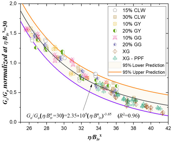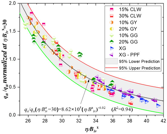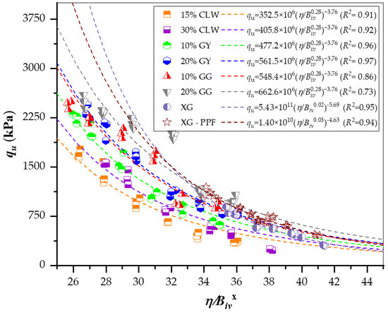 The porosity/binder index (η/Biv), originally developed by Consoli et al. [39] (3), has become a key tool in the rational design of soil–binder mixtures. By establishing a relationship between the void content of compacted soils and the absolute volume of binder, this index provides a robust physical foundation for predicting mechanical behavior—including unconfined compressive strength (qu) and small-strain stiffness (Go)—through the power-type relationship shown in Equation (1).