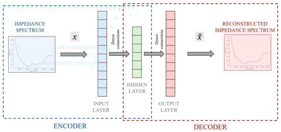 Autoencoders are unsupervised neural networks that can handle large amounts of data and can also be applied to reduce the dimension of input data, extracting their most important features. The simplest configuration of an autoencoder is based on an encoding layer and a decoding layer, as shown in Figure 3. By means of the encoder, the input data, x, are mapped into an arbitrary lower dimensional space, h. The decoder reconstructs the original data as an output  from h []. Therefore, the input and its corresponding output should be as identical as possible to each other. In this sense, the optimal autoencoder corresponds to the encoding–decoding scheme, keeping the maximum amount of information when encoding and providing a minimum reconstruction error of the input data when decoding.