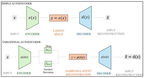 Figure 5 shows the difference between a deterministic traditional autoencoder and a probabilistic variational autoencoder. VAEs introduce probabilistic encoders and decoders. A probabilistic encoder, defined by p(z/x), describes the distribution of the encoded variable given the decoded one, while a probabilistic decoder, defined by p(x/z), describes the distribution of the decoded variable given the encoded one. In VAEs, the input is constrained to be encoded as a normal distribution over the latent space. Then, the decoding process is performed on sampled points from that distribution. Finally, the reconstruction error on these sampled points is backpropagated through the network for training. In this case, training is required not only to guarantee the performance of the encoding–decoding scheme, as usual, but also to organize the latent space by means of standard normal distributions as a result of the encoding procedure (regularization process), for which the mean and the covariance matrix of the normal distributions must be returned.
