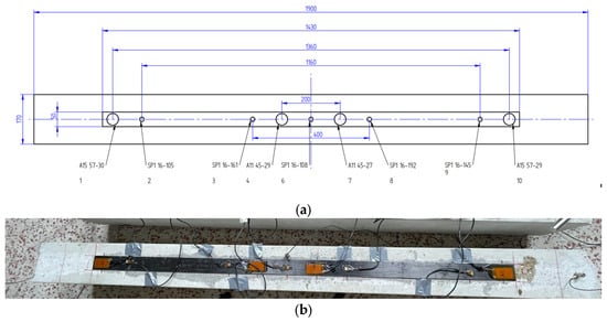 The beam specimen was tested under four-point bending (Figure 6). Electromechanical impedances were captured during the tests by means of nine PZT patches (Figure 7) bonded to the FRP strip. P-876.A11 and P-876-SP1 PZT types were used, except for close to the ends of the FRP strip, where P-876.A15 (61 mm × 35 mm × 0.8 mm) sensors were glued [].