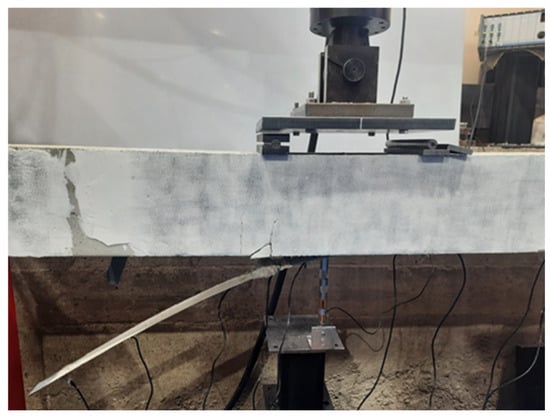 In each loading step, once the established load maximum was reached, the beam was completely unloaded, and the impedances were measured in all the sensors. Failure occurred due to the sudden detachment of the FRP strip as a consequence of the strong concentration of stresses that originated in the vicinity of a crack at the bottom of the beam, close to the left loading point. FRP debonding propagated towards the left end of the strip (Figure 8). Prior to failure, multiple cracks formed, first in the constant moment zone and, subsequently, in other areas of the beam. All of this extended cracking contributed to the subsequent failure of the beam. The first identified vertical crack occurred during test 3.