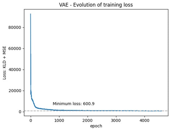 According to the dimensions of the impedance spectra captured with the PZT transducers and the synthetic data generated subsequently, this study arranged the input and output dimensions in 7209 × 1. Both the encoder and decoder of this proposed deep autoencoder architecture consist of three fully connected layers. The PReLU (Parametric Rectified Linear Activation) activation function was applied for all the layers. PReLU is a generalization of the traditional rectified unit, with a slope for negative values. Table 3 provides a summary of the proposed deep autoencoder architecture. The model was implemented using PyTorch 2.4. An Adam optimization algorithm was used for training of the autoencoder. With this procedure, learning rates are adapted for each parameter or weight individually. The network was trained for 2200 epochs, using an initial learning rate of 0.0001. MSE was used to measure the loss functions. Its evolution is shown in Figure 11.