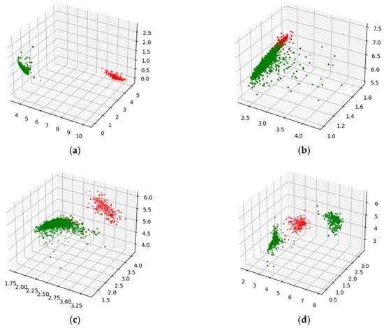 The distance between the red and green clusters served to determine if, in the vicinity of each sensor, the damage grew more or less gradually for the last two stages. However, the graphs in Figure 13 may be misleading, because for some sensors, the data points corresponding to the penultimate loading step were mixed with those of previous loading steps and could not be distinguished. The existence of enough overlapping clusters and decreased cluster homogeneity is, without a doubt, one of the main limitations of clustering when applied to the latent space of autoencoders. The clusterability of latent representations could be the purpose of a deeper future study.