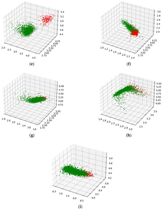 Representation of all data points (original and synthetic), sensor by sensor, in the 3D latent space: (a) PZT1; (b) PZT2; (c) PZT3; (d) PZT4; (e) PZT6; (f) PZT7; (g) PZT8; (h) PZT9; (i) PZT10.