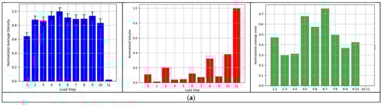 Ellipse overlap provides an additional perspective by focusing on the evolution of structural characteristics under different loading conditions. Unlike density and the convex hull volume, which address concentrations and spatial extents, ellipse overlap directly assesses the similarity in data distribution, thus capturing dynamic structural changes.