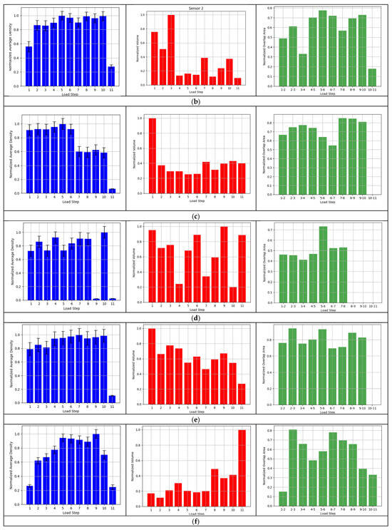 Finally, ellipse overlap histograms (third column of Figure 14 in green) show how the similarity in data dispersion varied between consecutive loading steps. In general, a high degree of overlap between consecutive steps indicates that the beam structure has not changed significantly, while a low degree of overlap suggests notable variations, possibly due to damage. By analyzing these histograms, specific patterns of how the beam responds to different load levels can be identified. For the sensors located on the left side of the FRP strip, the overlap level between the last two loading stages was zero or near-zero, which is a symptom of the subsequent sudden debonding of the strip. It is remarkable that there was zero overlap among the last four loading stages for sensor 4, the origin of the subsequent debonding.