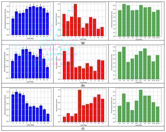 Figure 14 shows the evolution of the three indicators, average density (blue), volume of the convex hull (red), and ellipse overlap (green), presented in Section 2.4 to identify damage.