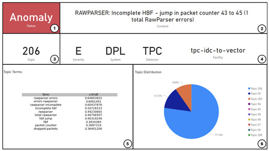 Dashboard information: (1) anomaly’s status, (2) log message’s content, (3) classified topic, (4) log message’s information, (5) topic terms, (6) topic distribution.