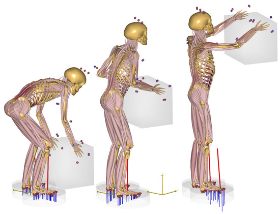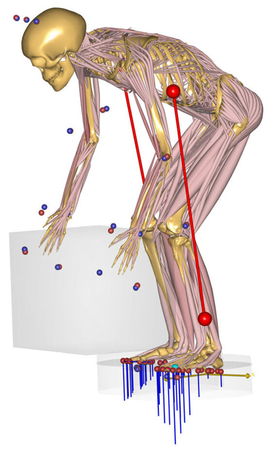 A musculoskeletal model of box lifting from the floor to a shelf. Blue lines under the feet represent the simulated pressure distributions, which add up to the ground reaction forces represented by the red vectors. The blue and red dots represent the postural matching of marker coordinates between the experimental motion data and the model.