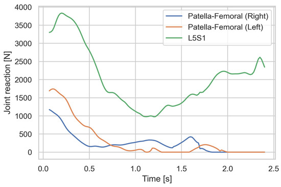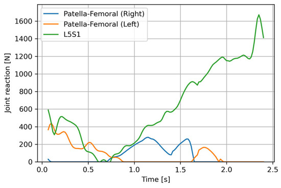As illustrated in Figure 1, the model has a significant level of detail, and it returns thousands of muscle forces and joint reactions, which could be compared systematically between the lifting model and the baseline gait model to identify anatomical structures that are prone to overloading. For the purpose of illustrating the workflow, we selected just two joint reaction forces, namely the compression force between the patella and the femur on each leg and the compression force between the fifth lumbar vertebra, L5, and the sacrum, S1 (Figure 2). These forces were selected because they peaked at, respectively, three and four times of the values for a normal gait cycle and could potentially cause injury if repeated many times over a work life. The L5–S1 joint reaction force has an additional peak towards the end of the motion, when the subject reaches forward to place the box and thereby increases the moment about the L5–S1 joint of the external load, as shown in the right frame of Figure 1. The patella–femoral force peaks at the extreme knee flexion in the beginning of the motion because the quadriceps tendon and the patella ligament simultaneously pull the patella into the trochlear groove.