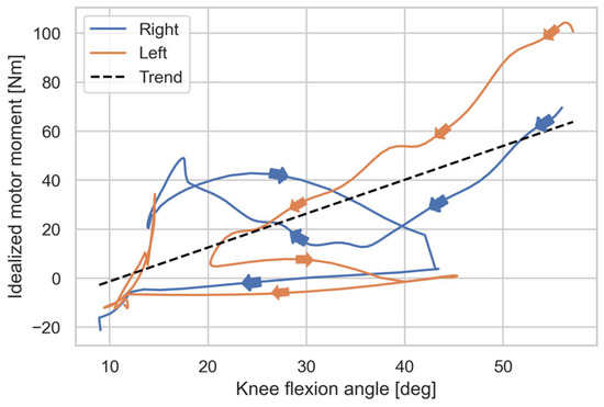 Idealized knee motor extension moments as functions of the knee angles; trend line. The arrows indicate the direction of movement.