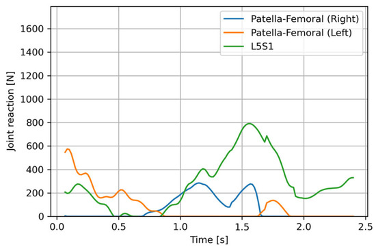 Patella–femoral and L5–S1 reaction forces with idealized bilateral linear actuators.