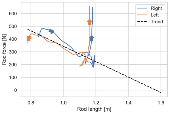 Idealized rod reaction forces and a selective trend line covering only the descending part of the two curves. The arrows indicate the direction of movement.