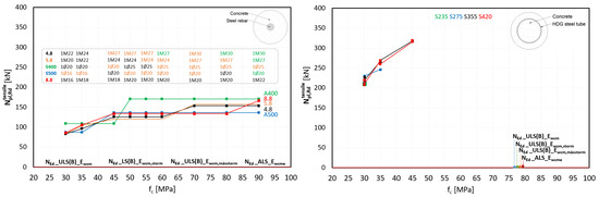 In terms of axial strength, it appears that the most unfavourable combination of materials for determining As,min was concrete C90/105 and DIN 4.8 steel rebar. These require a minimum reinforcement of 5.02 cm2, which can be fulfilled by a 30 mm threaded steel rod. As demonstrated, for all scenarios, the minimum reinforcement guaranteed that the compressive and tensile strengths (Npl,Rd) (Figure 11) clearly exceed the maximum axial stress NEd (−86.05 kN, refer to Table 3) obtained from the numerical model.