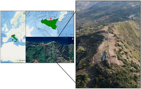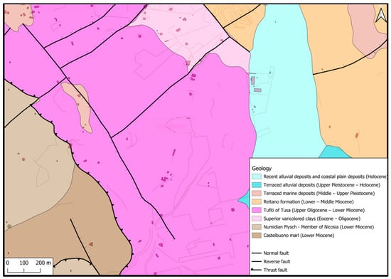 From a geological point of view, the investigated archaeological area falls into the Nebrodi Mountains, which are geologically part of the Apennine–Maghrebian Chain, one of the three main orogenic domains in the central Mediterranean [39]. The hill has a maximum height of 250 m and is located on the hydrographic left of the Tusa stream. In particular, the outcrop area falls within the varied formation called “Tusa Tufites” [40], which constitute an arenaceous pelite unit with a variable sandstone/pelite ratio (see Figure 3).