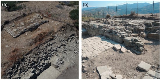 In the largest central temple, remnants of the cella floor, made of white tesserae, are still visible [4,37]. The platform’s perimeter walls were constructed using a mixed technique, combining argillite and sandstone blocks. These walls cover a natural argillite outcrop, still visible in some areas, which was probably leveled in antiquity to create a more regular platform shape. The same rock outcrop was also encountered in recent excavations south of the square, conducted between 2023 and 2024. These excavations have uncovered the southern boundary of the terrace, marked by a wall made entirely of argillite blocks, along with a structure made using a mixed technique, identified as a monumental stepped altar [38].