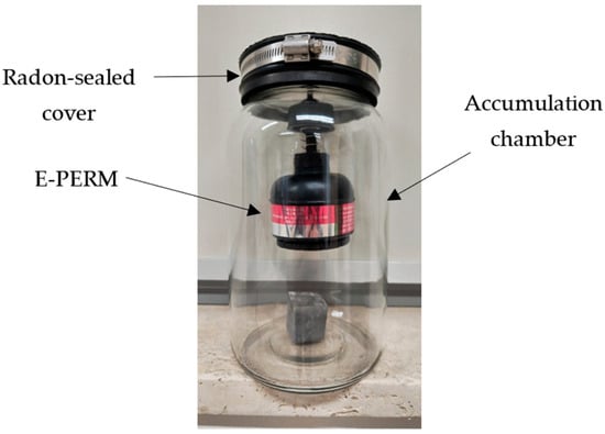 To determine the radon exhalation rate from each aliquot of the analyzed stones, measurements of the 222Rn activity that accumulated in a vessel after a specified build-up time were carried out through E-PERM electret ion chambers. During each run, temperature and humidity factors were constantly monitored and controlled. This method is referred to as the “accumulator method” [56] (see Figure 5).