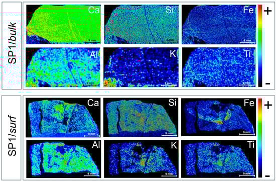 μ-EDXRF maps for Ca, Si, Fe, Al, K, and Ti detected in the bulk (cross-section, SP1/bulk) and external surface (SP1/surf) of SP1. The rainbow color scale relates to the intensity of the main XRF transition line of the corresponding element.