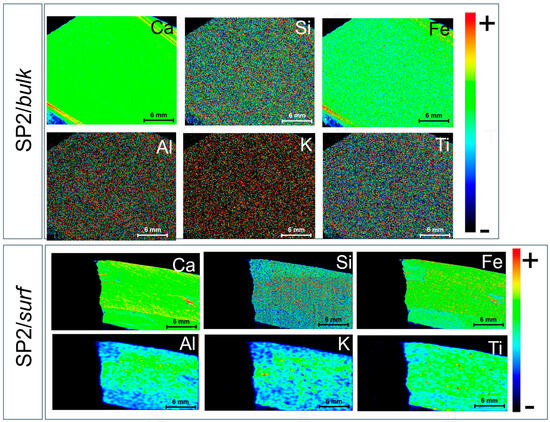Figure 6 displays the μ-EDXRF distribution maps of some main elements (Ca, Si, Fe, Al, K, and Ti) present in the bulk matrix (SP1/bulk) and over the external surface (SP1/surf) of the SP1 sample.