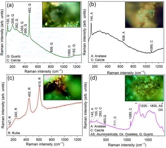 An inVia confocal Renishaw Raman microscope was used to perform the molecular characterization. The spectrometer was equipped with a Peltier-cooled CCD detector coupled with a DMLM Leica microscope, featuring a motorized XYZ positioning stage with integrated position sensors on the X and Y axes. The measurements were carried out using the 20× and 50× objectives, together with a 785 nm excitation laser. The measurement conditions were adjusted as needed for each sample to minimize fluorescence interference and prevent photothermal degradation. Instrumental calibration was performed daily using the characteristic silicon band at 520.5 cm−1. Raman spectra were acquired and processed using the Wire 3.0 Renishaw software. For spectral interpretation and phase identification, reference data from the RUFF spectral database were employed [42].