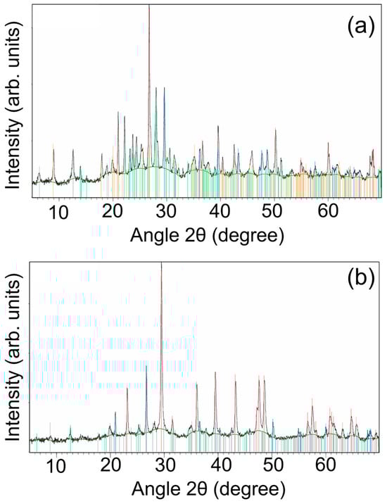 XRD measurements were carried out using a X’pert PRO diffractometer equipped with a copper tube (λCuKαmean = 1.5418 Å, λCuKα1 = 1.54060 Å and λCuKα2 = 1.54439 Å), a vertical goniometer (Bragg–Brentano geometry), a programmable divergence aperture, automatic interchange of samples, a secondary graphite monochromator, and a PixCel detector. The operating conditions for the copper tube were 40 kV and 40 mA, with an angular range (2θ) scanned between 5° and 70°. The resulting diffractograms were processed and interpreted using PANalytical X’pert HighScore software, in combination with the Power Diffraction Filedatabase (PDF-2) provided by the International Centre for Diffraction Data (ICDD) [43].