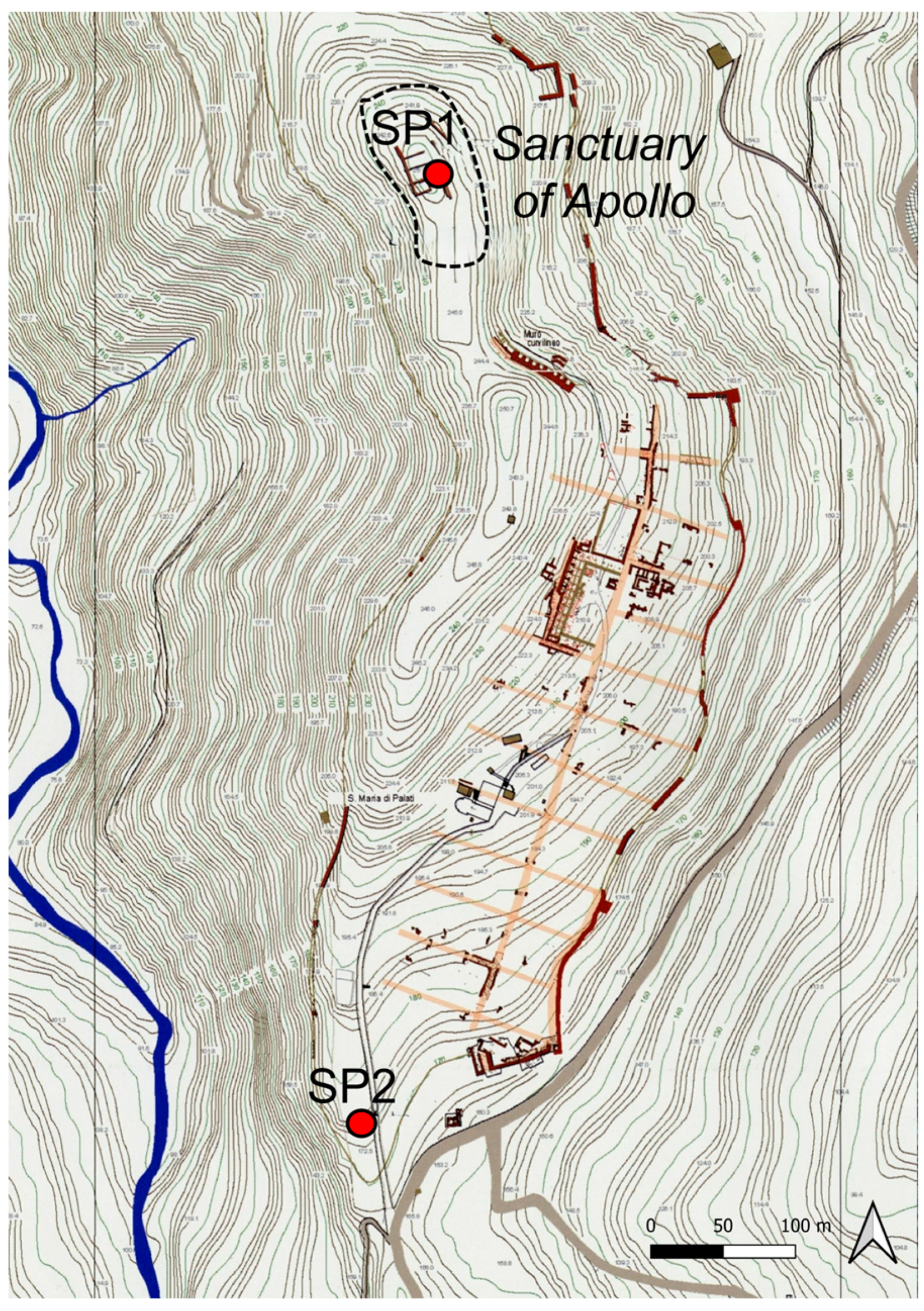 Specifically, SP1 was sampled near the ancient city buildings, unearthed during the 2017 excavation, directly from the Sanctuary of Apollo (GPS coordinates: 38°0′1.69″ N and 14°15′41.10″ E). SP2, on the other hand, was collected from the natural argillite bed incorporated into the city’s defensive walls, located in the southern sector, along the road connecting the Church of S. Maria delle Palate to the southern necropolis (GPS coordinates: 37°59′40.06″ N and 14°15′39.17″ E).