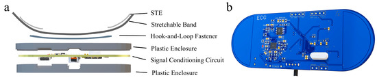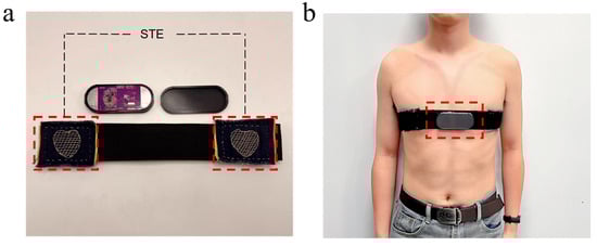 Unconstrained physiological signal monitoring is essential during physical activity. The structure of the proposed CEMS is illustrated in Figure 2a. The STE is sewn onto an elastic band, and its excellent flexibility allows it to stretch freely with the band. The soft and comfortable texture of the textile enables the CEMS to be worn securely around the chest, ensuring good contact with the skin. Figure 2b displays the printed circuit board (PCB) of the CEMS, which is enclosed in a plastic housing and attached to the elastic band using Velcro. The system’s compact size meets the needs of individual users and allows high-quality ECG monitoring without adding weight or restricting movement. This design provides a novel and practical solution for wearable ECG monitoring during daily exercise.