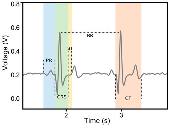 As illustrated in Figure 5, a typical ECG cycle comprises several characteristic waveforms, including three primary components: the P wave, the QRS complex, and the T wave. The voltage amplitudes and time phase parameters of these waveforms serve as quantitative indicators for ECG signal analysis. In this study, five time domain features, including P-wave to R-wave (PR) interval, S-wave to T-wave (ST) segment, R-wave to R-wave (RR) interval, Q-wave to T-wave (QT) interval, and QRS duration, were extracted and used as part of the input features for model training [40].