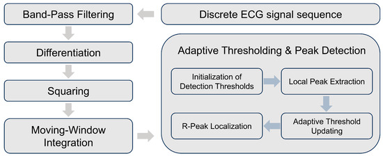 The Pan-Tompkins algorithm is an adaptive R-wave detection method that maintains a low false detection rate, even when R-wave amplitudes fluctuate [45]. Its process is illustrated in Figure 6. By applying a dynamic threshold to the moving window integral of the signal and updating this threshold in real time, the algorithm identifies candidate R-peaks that exceed the threshold. It then searches within a specified window in the original signal to locate the highest value among the candidates and confirms it as the true R-peak. The algorithm then proceeds to search for the next R-peak in the following cycle.