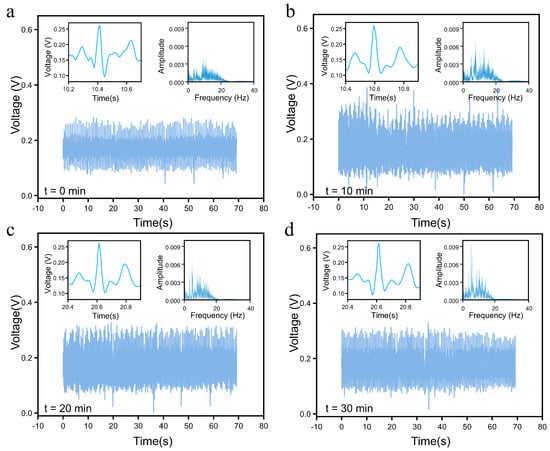 To obtain the test data, the subjects ran at a constant speed for 30 min, and the ECG signals of the subjects at 0, 10, 20, and 30 min of exercise were measured using the CEMS and saved. The test results are shown in Figure 7, where the changes in exercise time are observed: the waveform of their ECG signals displayed significant variability, and the amplitude of their Fourier transform spectra gradually increased. This indicates that as the exercise time progressed, the subject’s nervous system became increasingly active.