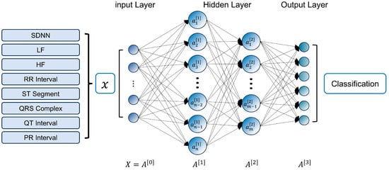 In this study, the eight ECG signal features mentioned above are used as inputs to build a classification model based on the fully connected neural network (FCNN) algorithm, as shown in Figure 8. The FCNN is a classical deep learning model, where all neurons in adjacent layers are globally connected through a weight matrix, and the network parameters are optimized using the back-propagation (BP) algorithm. Unlike a CNN, which focuses on spatially localized feature extraction [46], FCNN achieves nonlinear combinatorial mapping of features through a densely connected layer structure (comprising the input, hidden, and output layers). This structure allows FCNN to offer advantages such as fast fitting speeds and high accuracy, particularly in solving low-dimensional nonlinear classification problems [47].