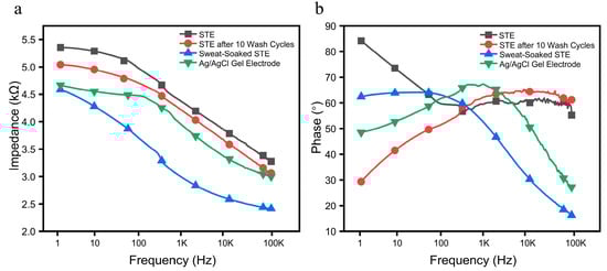 Interface impedance and phase between the STE and the Ag/AgCl gel electrodes on skin. (a) Impedance spectrum. (b) Phase spectrum.