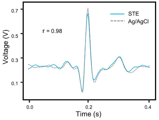 ECG waveforms were collected separately using the STE and the commercial electrodes within a short time interval, ensuring consistent experimental conditions. Both sets of signals were acquired through the same signal conditioning circuit. From each acquisition, one representative cardiac cycle was extracted for analysis. A Pearson correlation analysis was then performed on the two signal sets, yielding a correlation coefficient of (Figure 11), indicating a high degree of similarity between the signals obtained from the two electrode types. This result highlights the effectiveness of the STE in accurately capturing physiological signals and suggests its potential as a viable alternative to commercial Ag/AgCl gel electrodes.