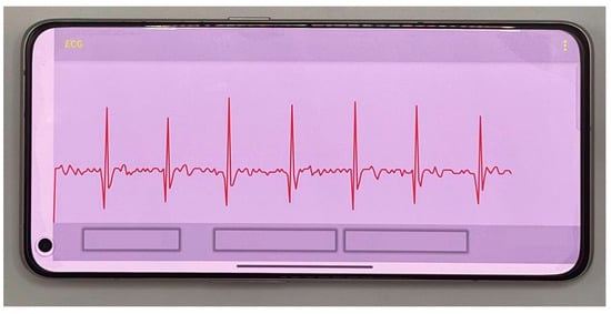 Traditional ECG monitoring devices often impose physical constraints that hinder users’ daily activities, significantly compromising user comfort. As shown in Figure 12a, the physical structure of the CEMS addresses this limitation. The STE is sewn onto the inner surface of an elastic band, enabling direct contact with the skin to facilitate ECG signal acquisition. The embedded system circuit board responsible for signal processing is housed in a compact plastic enclosure and is attached to the elastic band via Velcro, as illustrated in Figure 12b. The high flexibility of the STE ensures comfortable wearability, while the miniaturized design of the system allows users to wear it unobtrusively even during exercise. The subject’s ECG signals are transmitted from the skin surface to the CEMS via the STE. After passing through the filtering circuitry, the signals are acquired by the MCU and subsequently transmitted to a mobile device via a Bluetooth module (Figure 13), enabling users to observe and analyze the data in real time.