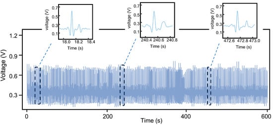 To evaluate the monitoring stability of the CEMS, a continuous testing experiment was conducted on subjects for over 600 s under a low-activity state. The results are presented in Figure 14. Throughout the test, the circuit operated continuously without interruption. The amplitude decay of the subject’s ECG signal was less than 0.08 V, and the standard deviation of the RR interval, a key ECG characteristic parameter, was 0.189 s. Additionally, the system successfully captured complete characteristic waveforms of the subject’s ECG signals. These results demonstrate that the CEMS exhibits excellent stability and is capable of providing reliable ECG monitoring during daily activities.