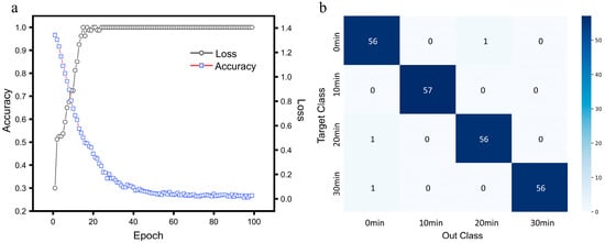 In this study, two hidden layers containing ReLU activation functions were setup, with 12 neurons in the first hidden layer and 8 neurons in the second hidden layer. For the experiment, a stratified sampling method was used: 70% of the original dataset was allocated to the training set, 30% to the testing set, and 20% of the training set was further divided into a validation set. The datasets were independent of each other, without duplication. During training, the cross-entropy loss function was employed as the optimization objective function, and parameters were updated using the Adam adaptive optimizer. The learning rate was set to 0.005, and the Dropout layer discard ratio was set to 0.1. After 100 epochs of training, the FCNN model exhibited stable convergence characteristics. The change curves of the loss rate and accuracy are shown in Figure 16a, where the loss function values for the training set showed a monotonically decreasing trend, and the classification accuracy of the validation set stabilized at about 98.7%. To quantitatively evaluate the classification performance of the model, Figure 16b presents the confusion matrix for the test set, showing the classification of each example in the test set. The model demonstrated high classification accuracy and good overall performance.