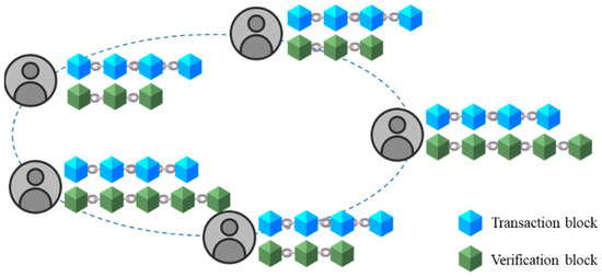 In actuality, it takes a lot of time to synchronize block content to each node in the blockchain. Also, the original reputation value mechanism in the blockchain system is often designed to resist sybil attacks with high-cost computing. However, the lack of reward mechanism easily causes the application of blockchain systems to be inactive or even decline. In order to solve the above problems, Wu et al. [21] have introduced the design of a dual blockchain to allow nodes to only save information related to themselves. Specifically, a reputation value system with reward feedback is built up to maintain the block. The operation within the chain could be balanced to avoid uneven resources. As shown in Figure 1, each user has two chains, namely the transaction chain and the verification chain.