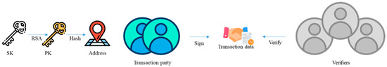 The flowchart of the dual blockchain is shown as Figure 2. First, the private key is processed through RSA to generate public key , and is manufactured through the hash function to lay out the wallet address. When a transaction occurs, the buyer calculates the transaction information, before signing and broadcasting it to the blockchain. Finally, it is handed over to the verifier for transaction verification.