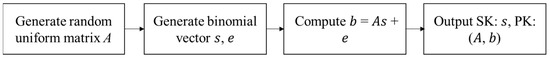 Step 1: The key used for encrypting shared intelligence is created by CRYSTALS-KYBER. The process is shown in Figure 5. Initially, a random uniform matrix is generated. Subsequently, the binomial vector is derived from , with the vector representing error coding. Following this, is computed, thus leading to the generation of the private key and the public key .