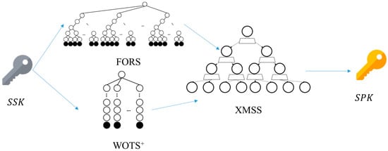 Step 2: The blockchain key is constructed by SPHINCS+, as shown in Figure 6. First, user chooses a random number to create the private key seed , sets it to the WOTS+ and FORS bottom layer of SPHINCS+, which goes through the hash function to build the WOTS+ and FORS trees, and then XMSS connects FORS and WOTS+ to generate a and .
