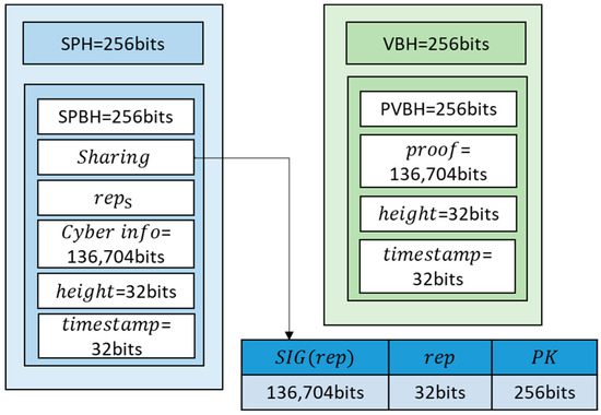 AQRB leverages SPHINCS+ as the algorithm to construct the blockchain and selects SPHINCS+-128f as the parameter with the same robustness as ECDSA (P-256). According to the information block and verification block content in Figure 10, the data size of Cyber information is 136,704 bits, and are 256 bits, and are both 32 bits, is 137,312 bits, and the total number of and verification blocks depends on the number of information maintenance companies . Therefore, the storage space is estimated based on the three conditions: supply and demand balance, oversupply, and undersupply. With the block establishment condition being twice that of the reputation value, it requires 2–4, 5–7, and 1 company maintenance for each condition discussed.