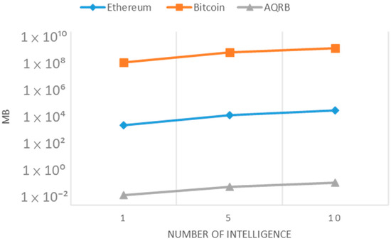 Figure 11 illustrates the storage costs of sharing block and verification block under different numbers of companies participating in the data maintenance. As the number of companies increases, the storage space required for both sharing block and verification block increases, impacting the total storage space consumption. Figure 12 illustrates the advantage of AQRB in terms of storage cost compared to popular blockchain like Bitcoin and Ethereum. As of now, the record shows 46 million users, with an average block size of 1.5 MB for Bitcoin. Ethereum has 378,000 users with an average block size of 72,000 bits. In contrast, AQRB requires the storage of only those nodes that are pertinent to its operation, thereby achieving significant data storage efficiency.